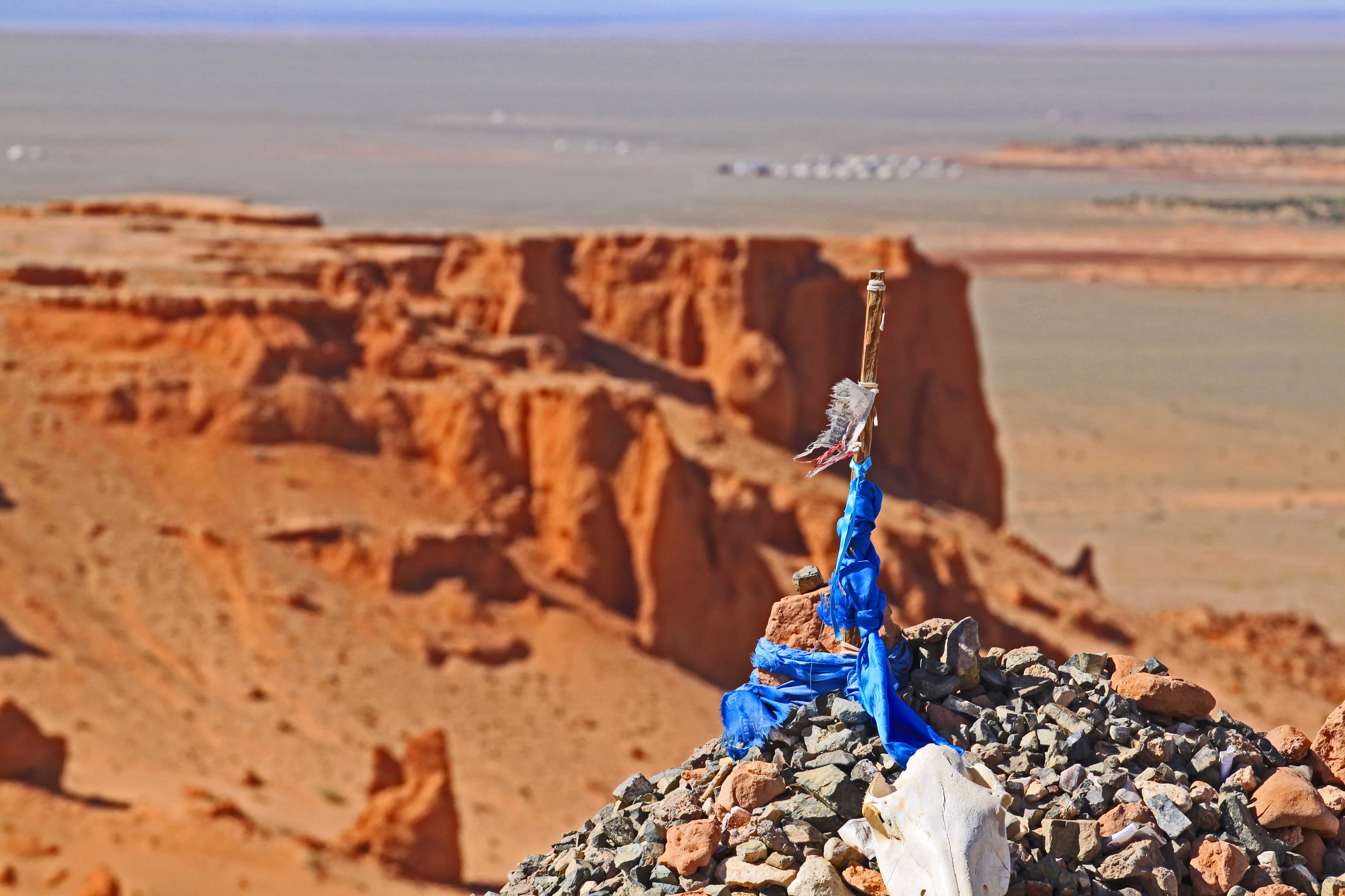 Day 6: Bayanzag and the Flaming Red Cliffs. Internationally known for its complete dinosaur skeletons and fossilized eggs of the Cretaceous period, here dinosaurs lived 70 million years ago. We’ll also see the Red Flaming Cliffs and pedestal rocks formed by the aeolian effect on the sand and rock over millions of years (photo left). Overnight in a Ger camp.