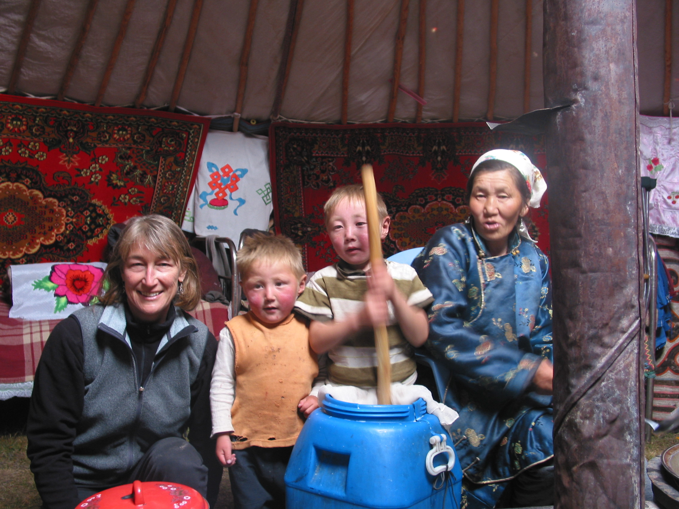 We’ll walk through the Singing Sand Dunes of the South Gobi, and see the Red Flaming Cliffs where dinosaurs roamed 70 million years ago and laid their eggs, now fossilized in stone. A visit with a camel-herding nomad family invites you to ride a camel and taste dairy products made of camel’s milk, including a pungent drink that the children (photo left) are churning for consumption.